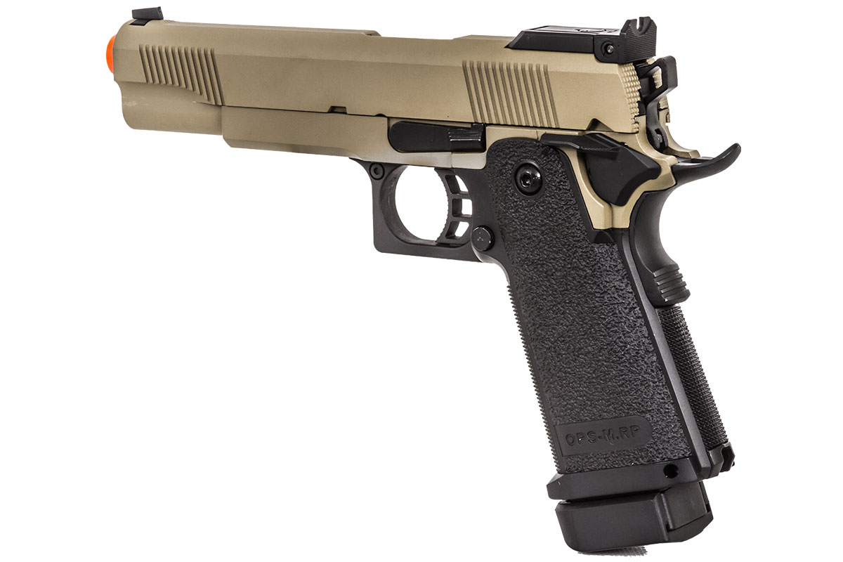 JAG Arms has finally brought their version of a high capacity magazine gas blow back pistol. The GM5 is compatible with Tokyo Marui and WE Tech parts and magazines giving you many options to upgrade and repair the airsoft gun in the long run. The extra BB capacity will assist in outplaying others in pistol only matches or if you simply need a weapon with more ammo storage. The frame and slide are constructed out of a light weight yet durable metal that works flawlessly with the hard felt blowback action. As an extra precaution, the grip safety toward the rear must be compressed with your hand to allow the trigger to pull back for a shot. Additionally, this model has longer slide compared to its GM4 counterpart and an attachment point on the bottom of the grip for a pistol sling. Overall, the JAG Arms GM5 is a top option for those looking to use their pistol as a primary with tons of compatible magazines and upgradeable internals available in the market.