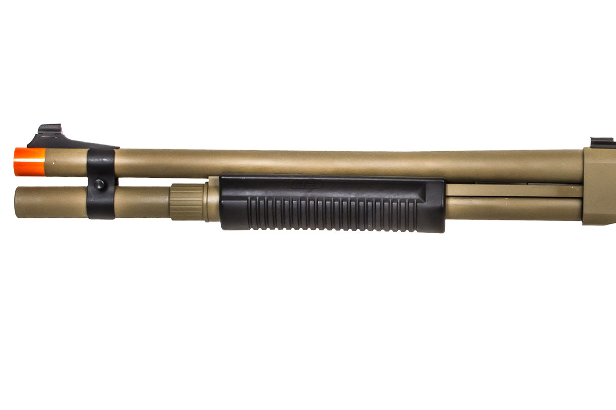 Powered by green gas, this all metal shotgun is capable of firing between three and six BB's at one time by manipulating a switch near the ejection port. The scatterguns have three inner barrels with individual fixed hop up units, giving you great CQB range as well as a decent amount of BB spread. The shotgun features a removable gas tank located inside the butt stock of the airsoft gun. The shotgun is compatible with any TM 30 round style shell, and the 30 round shells used for UTG Spring Shotguns, which is predominately used in M3 style triburst shotguns. One major advantage that a gas shotgun has over a spring shotgun is the ease in which it takes to cock the gun. Without a spring needing to be compressed, the hand guard moves almost effortlessly for speedy followup shots. In addition, the realism in both operation and sound is unparalleled in gas shotguns.Specifications: