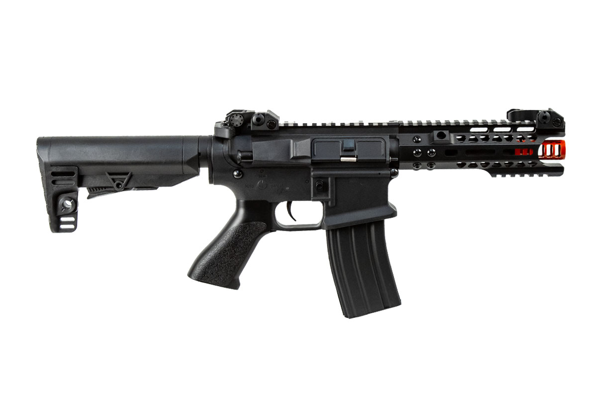 JG has done swell job in providing the market with affordable airsoft guns that are worth getting into the game with or upgrading. This model features a light weight polymer frame paired with a metal M-LOK rail system and metal orange flash hider. The M-LOK handguard is about 7 inches in length with a QD sling mount on both sides and an integrated rail section toward the front bottom of the rail. Additionally, the top has a rail section that is streamline with the receiver to equip the attachments you desire to customize the airsoft rifle. The airsoft gun comes with front and rear flip-up sights that can fold down if you wish to use a red dot or scope. At the rear of the M4, there is a uniquely designed collapsible stock with QD sling points that are also on the left and right side. Simply utilize a slim stick lipo battery in the buffer tube to power the airsoft gun and achieve up to 360-370 FPS out of the box.