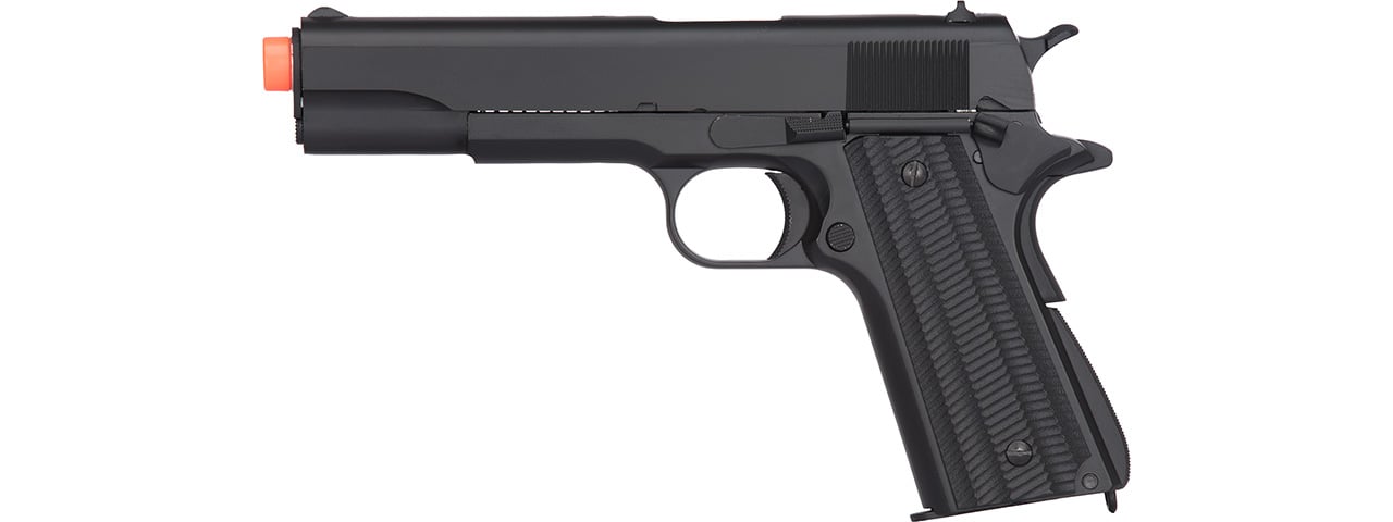 This story is about the 1911A1, and all of its glory. This replica of the legendary sidearm is powered by green gas instead of pure patriotism. With 24 rounds it gives you all the firepower you would ever need to dispense freedom on an enemy team. This gas blowback pistol is full metal in order to give the most realistic feel as well as up the durability. Clear buildings, storm the beaches, or just laugh at people that have them there plastic tupperware guns. Express your love for the good ol' days by grabbing one today and joining the fight.Specifications: