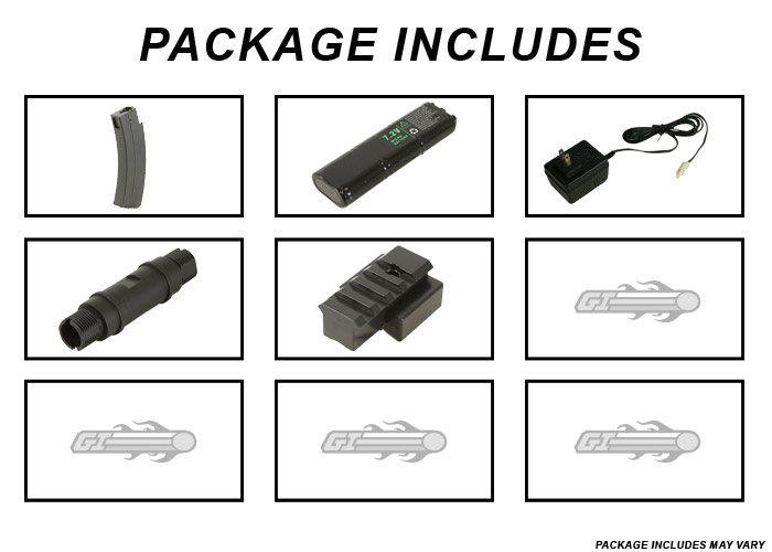 Package Includes: Battery, Charger, Manual, magazine, Loader, Cleaning Rod, 200 pcs 0.25BBs