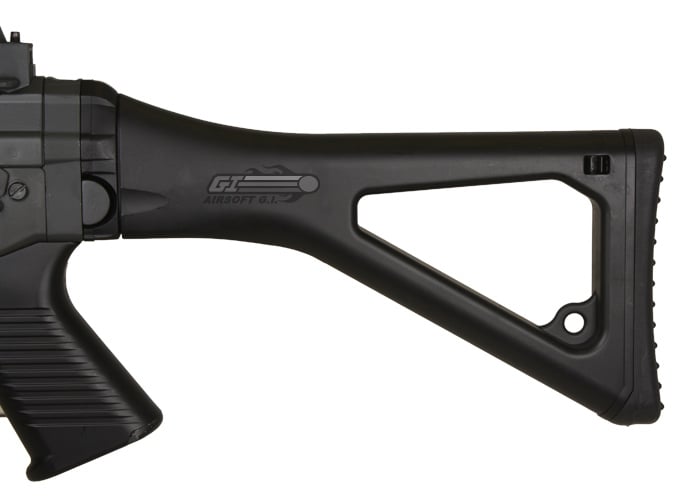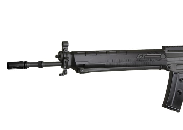 Another great new release from JG. The folding stock locks securely into place on the right side of the gun. The front and rear sights are adjustable for different light apertures. The front and rear sling mounts are metal for a secure sling fitment. The front hand guard on this gun has a built in bipod. If you're looking for a great outdoor gun that's different from your average M16 and/or AK, the 550 is exactly what you need.