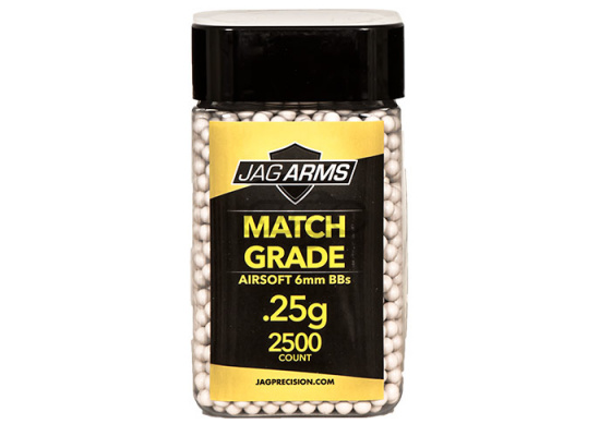 JAG Arms BBs are the solution to affordable high quality bulk airsoft ammo. These BBs are double polished and have tight manufacturing tolerances to guarantee zero air bubbles. This translates to flawless feeding and consistent accuracy across the board. JAG Arms BBs are available in different variations from .20, .25, and .28 gram weights for standard BBs and .30, .36, and .40 gram weights for heavyweight BBs. Standard weights are available in Match Grade, Tracer, and Bio Grade versions. All Jag Arms BBs come in either 2500 or 5000 count reusable bottles.