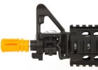 Javelin Gun Works Full Metal M4 CQB RIS Electric BlowBack Airsoft Gun. The Javelin Works Full Metal M4 CQB is a short barreled version of the m4 carbine with a full metal body, retractable stock and metal rail system. The Javelin Full Metal M4 CQB features a Electronic Blowback system that provides realism as well as a good amount of recoil. The gun uses a 300mm barrel, making it perfect for CQB games as well as mid range engagements. The rail system of the gun is slightly fatter then the usual rail interface system, this is because the battery is housed inside of the rail system allowing the use of any stock. The body is a high quality full metal body without any creaks or flex and the finish looks great. The retractable stock looks very similar to a LE style stock with a few changes in design and a small rail mounted on the right side of the stock. The carry handle is full metal and is mounted very securely to the upper rail of the gun.