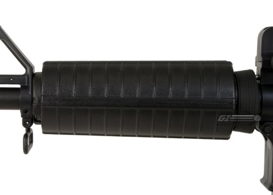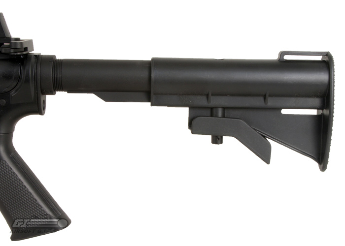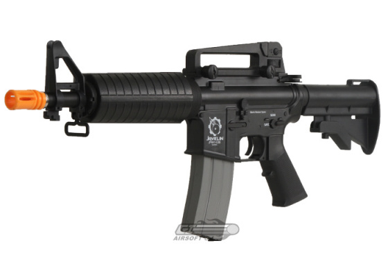 The Javelin Airsoft Works M933 Warrior ABS Series Electric BlowBack Airsoft Gun is a short barreled version of the m4 carbine with a highly durable ABS plastic body, retractable stock and polymer hand guard. The Javelin M933 features a Electronic Blowback system that provides realism as well as a decent amount of recoil. The gun uses a 300mm barrel, making it perfect for CQB games as well as mid range engagements. The Javelin M933 uses a standard m4 hand guard where the battery is also housed. The body is constructed of a high density, and highly durable ABS plastic that keeps the gun lightweight, and the finish looks great. The retractable 733 stock is adjustable to five positions. The carry handle is full metal and is mounted very securely to the upper rail of the gun, and is easily removed exposing the tactical rail section, perfect for mounting optics.