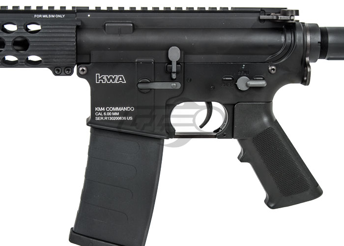 The KM4 Series by KWA are fully automatic electric guns that follow many of the same external aesthetic features of the original AR15 style rifles. Full metal alloy receivers ensure that the weapon is strong and robust. A flat top receiver allows the user to attach an optic or utilize the included adjustable rear sight. Six positioned battery stocks give the operator the most comfortable shooting position while providing ample space for batteries. The proven 2GX gearbox and an enhanced 2G hop-up bucking provides the KWA Commando with long lasting reliability and performance.