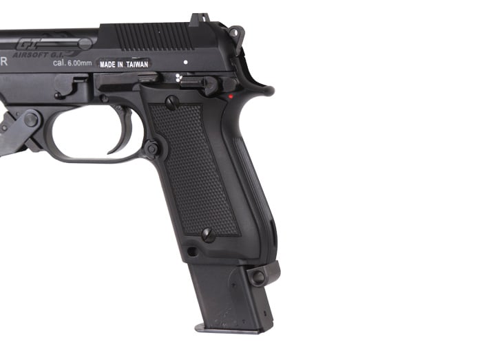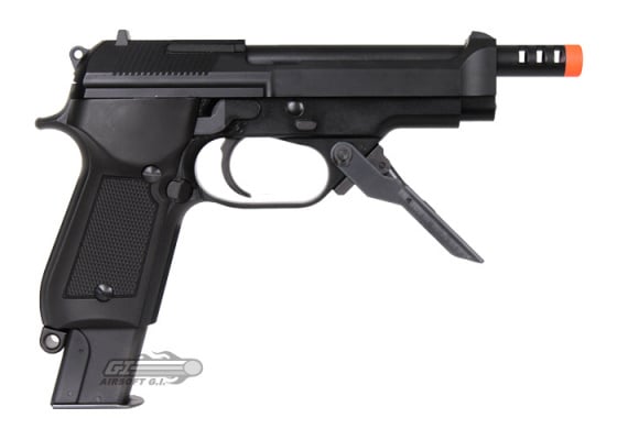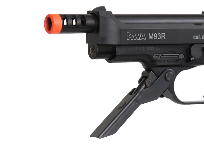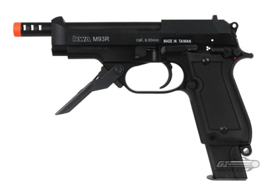 The KWA M93R 2009 Model is a great update to the previous M93R. KWA has achieved an extremely fast rate of fire by replacing the metal lower receiver with a plastic one, as well as updating the internals of the M93R. This pistol operates on semi-auto, 3 round burst, and full-auto. The magazine well is modified to fit the thumb of the support hand for the forward grip. The magazine is extended for a greater capacity. Another great update to the 2009 model is the finish, the entire black finish on the gun really adds to the tactical and newer look of the pistol. Although the pistol is designed for right handed shooters it's very comfortable in the opposite hand. This a great new pistol to add to your arsenal from KWA.