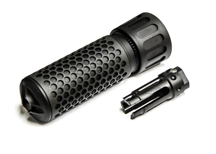 The licensed, Knight's Armament Company, QDC barrel extension is constructed out of aluminum with a steel flash hider for the utmost durability. The matte finish prevents reflection from sunlight as well as protecting the barrel extension from rust and heavy scratches. The QDC suppressor is unique because of its quick detach mechanism that is true to the real steel version's form factor and function. The thread of the flash hider has been modified to fit ONLY on the airsoft version. With a 1:1 scale to the real steel suppressor, it will add more realism to your operations.