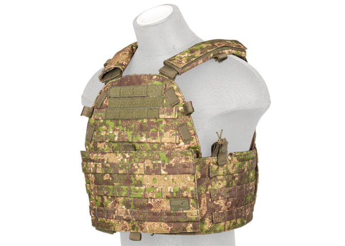 [30972 / CA-311P]The Lancer Tactical 6094 Plate Carrier is sized to fit most by being adjustable for height and girth. The front and rear panels accept medium ( 10"x12" ) shooter cut armor plates and the closures for each plate pocket insure they are seated at the proper height. The front panel has a section of loop Velcro for the attachment of patches, IFF, ID placards, name tapes, etc. The front panel also has an integrated triple magazine pouch for ease of use. The rear panel of the carrier has an emergency drag handle. The cummerbund has internal pockets for 6"x6" ballistic side plates and radios or magazines. Outer edge of the carrier has guides with Velcro closures for hydration tubes and comm wires.