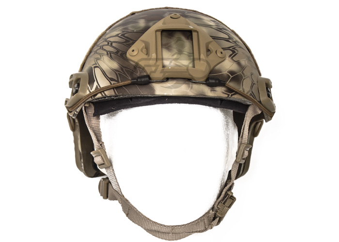 The Lancer Tactical Basic Helmet is the newest helmet design available for our military, law enforcement, and responsible civilian. It is very lightweight, and the ventilation holes on the top of the helmet keep the operator fast and cool. The Lancer Tactical Helmet comes with an integrated military style Head-Lock Chinstrap, which can be adjusted in 5 different locations. The dial on the back of the helmet allows the operator to quickly adjust the fit of the helmet. This helmet also includes several velcro panels along the top, side, and back of the helmet allowing for multiple patches to be added to the user's preference. A snake skin style tan camouflage scheme has been painted on this helmet to help it blend better into arid environments.