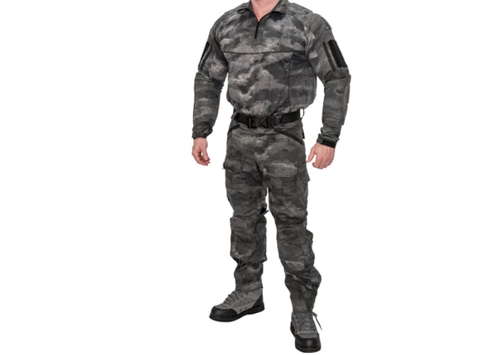 The Frog Shell combat uniform from Lancer Tactical comes as a full set, and is made from a mix of polyester and cotton that creates a clothing item that resists rips and tears. The shirt is primarily polyester material, and is entirely printed in ATACS LE camo. The pants are made of the "rip-stop" material with a 35/65 cotton/polyester mix and feature an integrated knee pad system, with knee pads included with the set.