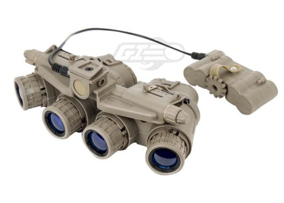 [SF09][14430 / CA-737T]The GPNVG-18 was made famous for their use by Navy Seal Team Six, as depicted in the movie Zero Dark Thirty and the novel, No Easy Day, recounts of the raid that put an end to the hunt for Osama Bin Laden. The revolutionary design provides a greater field of view then single and dual tube night vision devices by having 4 intensifier tubes and objective lenses arranged in a panoramic configuration. Although, the Lancer Tactical GPNVG-18 is a replica and non-functioning it will certainly bring your Navy Seal load out to the new level. The Lancer GPNVG-18 includes the dovetail adapter, external battery pack, and cable. These goggles come in a tan finish with blue lenses. These do not provide any night vision capability at all and are only a dummy set.