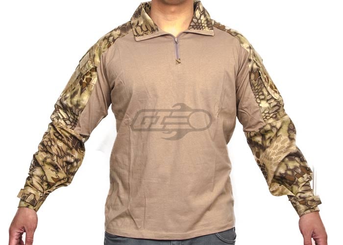 [16855]The Emerson Combat Shirt by Lancer Tactical is the perfect blend of a high durability BDU and the comfort of a base layer. The Emerson Combat Shirt features BDU style sleeves that include the same features that you would find on a many BDU such as pockets with Velcro, reinforced elbows, and adjustable cuff closure. This product also features a zipper high collar for neck protection and easy donning. Two pockets near the elbows are designed for elbow pad inserts. The body of the Emerson Combat shirt consists of a nylon/cotton blend base layer, which is breathable and helps cool off the user much faster than a standard BDU Coat. The Emerson Combat Shirt is perfect for a Spec-ops style load out or for anybody that likes the look of a standard BDU but also needs the comfort and mobility of a base layer.