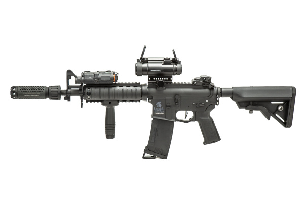 This particualr Gen 3 is actually part of a the Field Ready Combo lineup, meaning it will come including with all the accessories pictured. These include an Acetech Predator MKIII Tracer unit, giving the rifle a tactical appearance as the tracer is styled after a suppressor. Also included is a Tac9 PEQ 15 for painting targets for you and your teammates, and a Dual Red and Green Dot sight. Combined these accessories give the rifle a vintage aesthetic akin to the rifles configured by various special forces units during the early days of OIF and OEF.