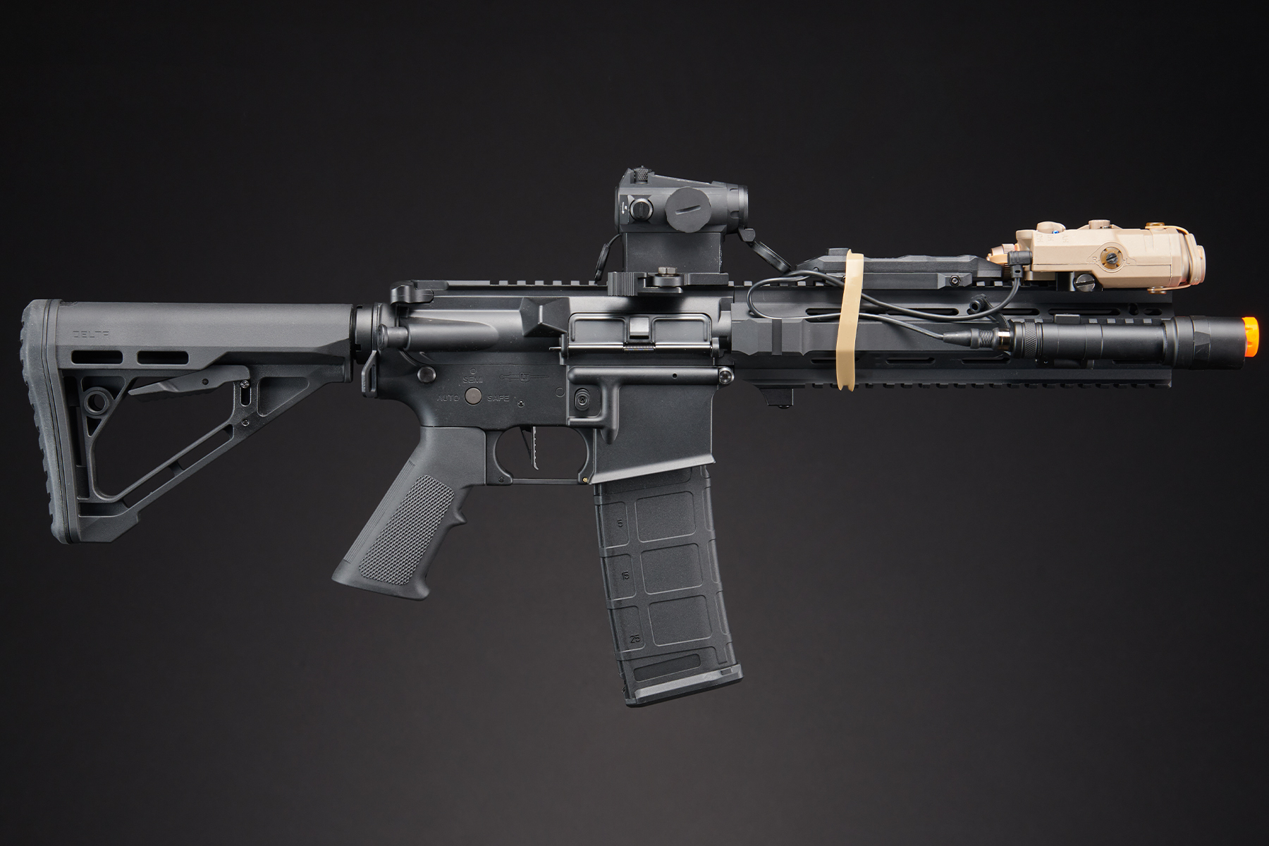 - Package includes: Gun, magazine, Accessory Bands, Light, PEQ, Optic, and pressure switch
