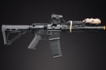 Outfitted with an Atlas Custom Works M640U Scout Light PRO Rail Mount LED Flashlight (Black), this rifle setup ensures superior illumination in low-light environments. The ACW LA-5C PEQ-15 Illuminator with a built-in flashlight and visible/IR green laser (Dark Earth) enhances target acquisition and adaptability in nighttime operations. The included Atlas Custom Works xForce XTSP Red Dot Sight with QD Mount (Black) provides rapid target acquisition and precision aiming in high-stress engagements.