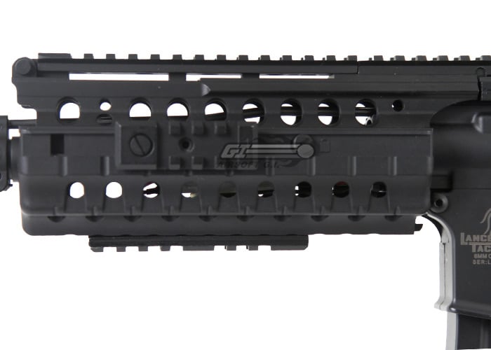 The Lancer Tactical M4 S-System AEG Airsoft Gun is a very impressive piece of craftsmanship. Not only does it come with a very modest price tag, but it provides incredible value for each dollar spent on it. The body of the M4 is constructed out of polymer, which makes it lightweight enough that you can carry it around the field for hours without becoming fatigued. The S-system RIS unit is very realistic, the hand guard is constructed of polymer to keep weight down but the rail segments are metal to provide a solid mounting surface for accessories like vertical grips, flashlights, lasers or PEQ boxes and cameras.