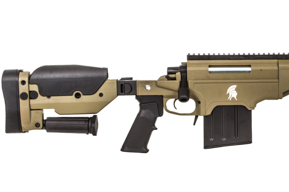 The Lancer Tactical LTR338L Spring Sniper Rifle is a unique airsoft gun. The front assembly of the gun features one piece polymer rails on the left and right side for mounting accessories such as flashlights, lasers or offset optics. The lower rail portion allows the operator to mount a bipod or fore-grip at a specific point. The monolithic upper rail gives the user a wide selection when it comes to mounting their optic for the perfect eye relief. The stock contains a folding feature for transportation as well as a built in adjustable monopod for the utmost stability when firing. The stock also features an adjustable cheek rest and butt pad for the most comfort to the user. Internally, the gun features quality parts and is mostly VSR10 compatible.