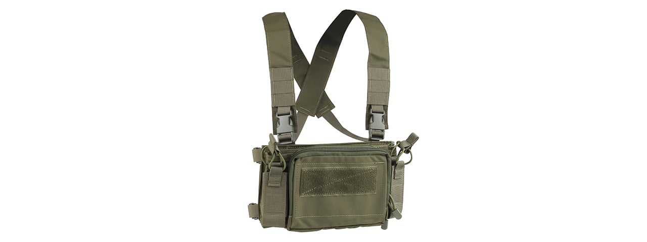 [71534 C11-87G]The Lancer Tactical Micro Chest Rig is a compact yet extremely capable chest rig to give you the edge on the airsoft field. Despite its small footprint, the Lancer Tactical Micro Chest rig uses every square inch of its design to pack it full of useful features to make you a valuable asset on the airsoft arena. It features an open-top triple M4 magazine pouch with plastic inserts. The open top design allows you to draw magazines at lightning speed while the plastic inserts inside each pouch locks the magazines in place and stays in place while you run, jump, dive, or roll on the airsoft field. Each side of the chest rig features a double pistol magazine pouch with a bungee retention loop and can fit a wide variety of airsoft pistol magazines, flashlights, and multi-tools. In the center of the chest rig, there is a large utility pouch for any other items you wish to bring with you onto the airsoft field. The Lancer Tactical Micro Chest rig come included with a lightweight harness secured via swift clips, which allows you to convert this chest rig into a placard for any swift clip compatible plate carrier. Do not underestimate the small size of this chest rig. The Lancer Tactical Micro Chest rig can easily fit everything you may need for a hard day of airsoft gameplay!
