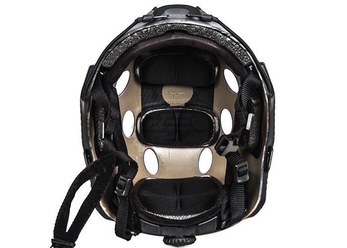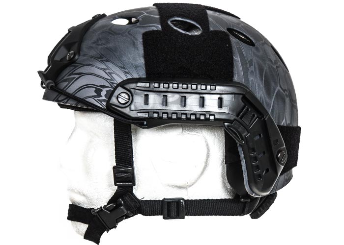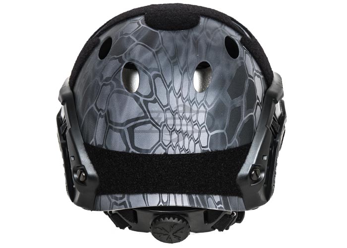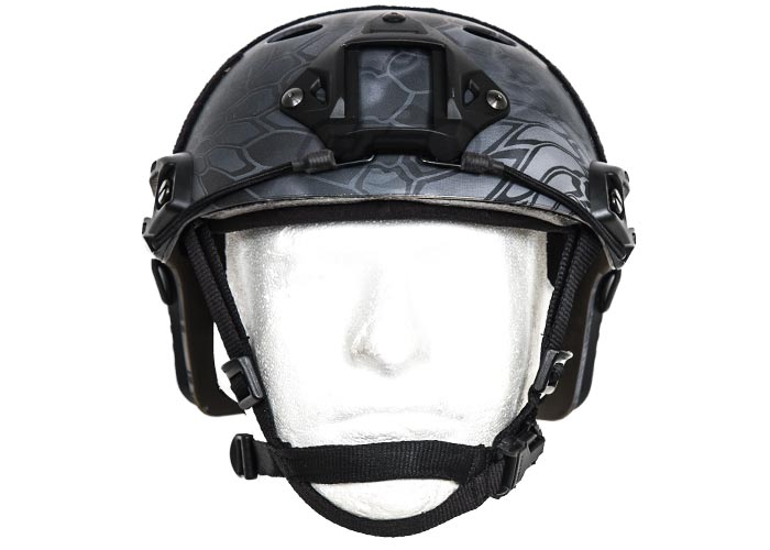 The FAST (Future Assault Shell Technology) Helmet is the newest helmet design available for our military, law enforcement, and responsible civilian. It is very lightweight, and the ventilation holes on the top of the helmet keep the operator fast and cool. The Lancer Tactical PJ Fast Helmet comes with an integrated military style Head-Lock Chinstrap, which can be adjusted in 5 different locations. The dial on the back of the helmet allows the operator to quickly adjust the fit of the helmet. This helmet also includes several velcro panels along the top, side, and back of the helmet allowing for multiple patches to be added to the user's preference. A snake skin style tan camouflage scheme has been painted on this helmet to help it blend better into arid environments.