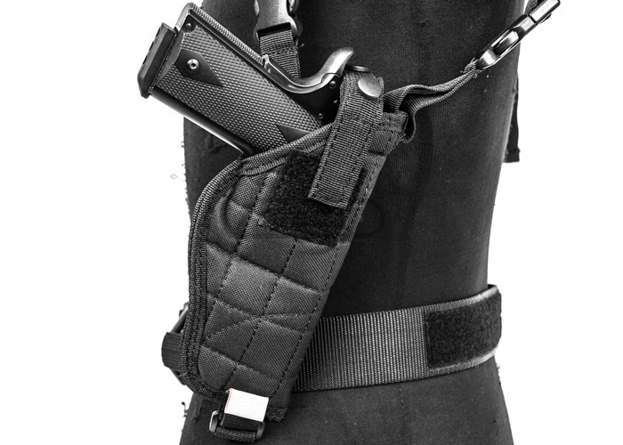 [V03C04][15283 / CA-349B]The Lancer Tactical Vertical Shoulder Holster is a great alternative to a leg holster. The straps are adjustable to fit anyone of any stature. Opposite of the holster, on the right side of the rig there is a pouch that holds two (2) pistol magazines. Adjustable Velcro flaps over each magazine will insure they are held securely. The holster is oriented around the back and sides of the body making it a perfect compliment to a chest rig and tactical belt.