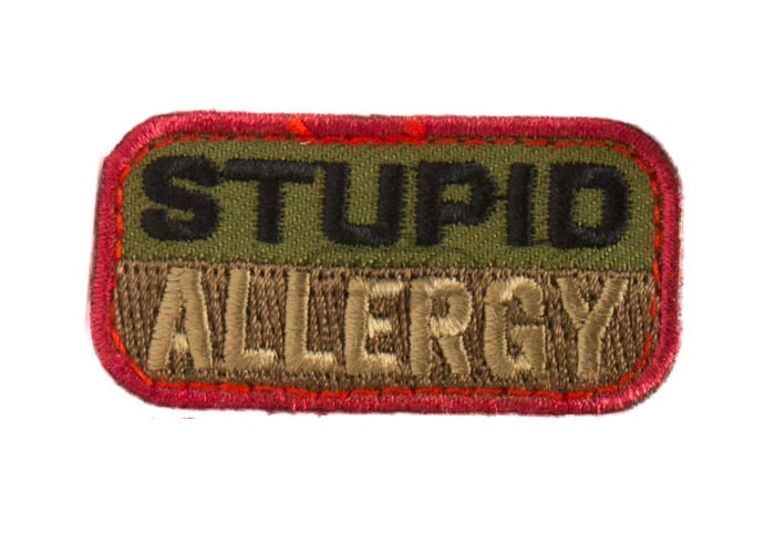 Some medical comedy for ya, let others know you have a low tolerance for stupid. NOT recommended for those with any actual allergies. Velcro backing readily available to attach to hats, tactical gear, and other equipment.