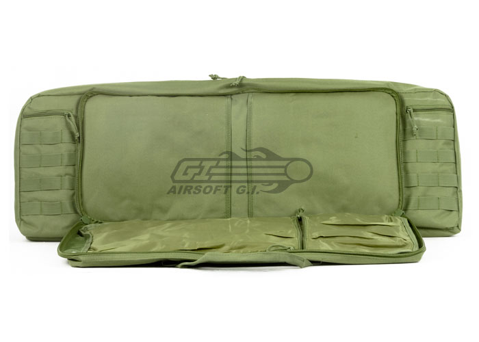[S11B03][12219 / CVDC2946G-36]The NcSTAR 36" Double Carbine Case Gun Bag is a great way to store and transport your long rifle. The rifle compartment can hold up to two rifles and the side compartments can hold up to two pistols. It can also fit spare magazines on the side where you can put them into the MOLLE pouches. The rigid carry handle in the middle of the bag lets you grab this quickly on the go. Use the shoulder strap to carry the case if you need access to both your hands.