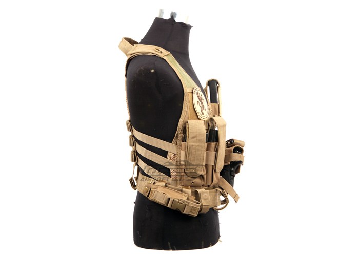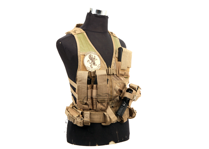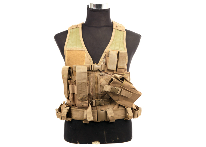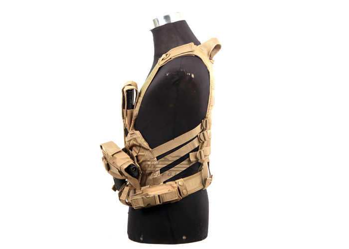 [H02D00][11575 / CTVC2916T]This tactical vest was designed for the smaller person in mind. It features 2 magazines pouches, on the right abdomen, that can fit a variety of different types of magazines. On the left abdomen is a fast draw pistol holster with pistol magazine pouch. On the left pectoral, there are two fixed pistol magazine pouches. On the back of the vest there is MOLLE to attach hydration carriers and other items. It also comes with a pistol belt which is equipped with another pistol magazine pouch that is mounted horizontally. To make sure everything is secure there is a zipper down the center, just like your everyday zip up hoodie, and it is reinforced with two buckles. This vest can hold everything that you need to carry for your primary and side arm.