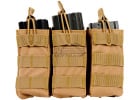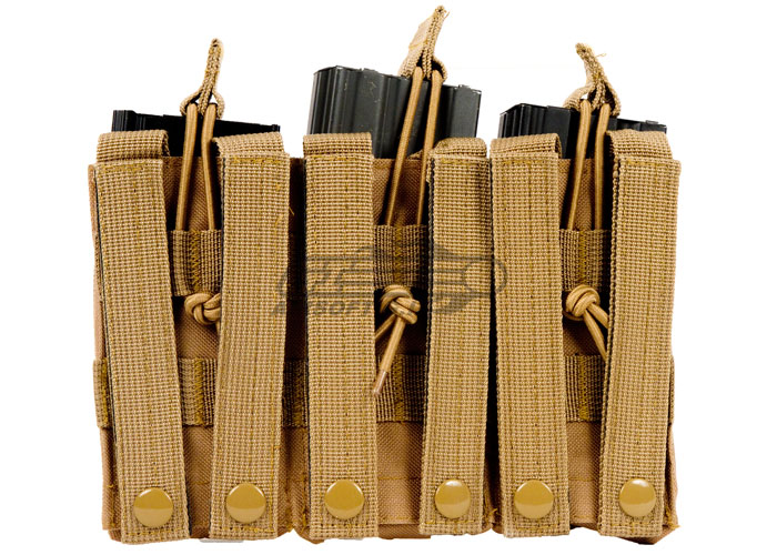 This MOLLE Open Top Triple M4 Mag Pouch fits three (3) M4 magazines. The open top of this magazine pouch gives the user quick access to his magazines in order to reload in a hurry. Adjustable strap with pull-tab to hold the mags tight. Grommet on the bottom of the pouch allows for drainage.