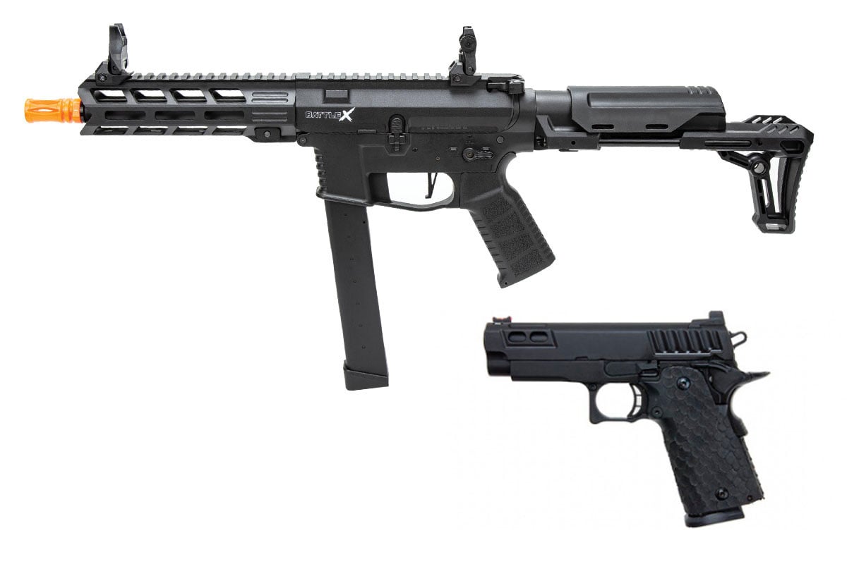 Sometimes a full length rifle or even rifle carbines might be too much. That's where the PDW class comes in handy. Small and incredibly lightweight, a personal defense weapon comes in handy for extreme CQB firefights. And when that fails, a good sidearm should always be there to back you up. That's why we at GI created the Pistol Fighter Combo Package Featuring the Lancer Tactical Gen 2 9mm Battle CQB Carbine AEG and an Army Armament Hi-Capa GBB Pistol! This new 9MM Carbine features a fully upgradable V2 gearbox; no ETU, no mosfet, no micro trigger to get in the way of your upgrades! In addition, the Army Armament hi-capas are 100% TM spec and can be fully upgraded, though considering how nice both the pistols and PDW shoot yo might not even want to!