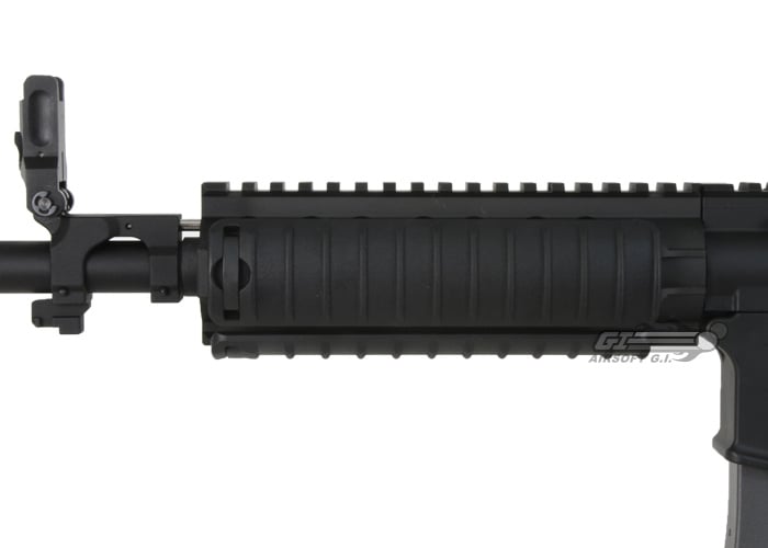 The fusion engine completely takes the place of the AEG's gearbox as a direct drop-in, which means that you no longer have to ever worry about stripped gears, broken pistons, or leaking cylinders. It is powered via a High Pressure Air (HPA) setup and only requires a small battery (7.4v-9.6v NiMH or Lipo recommended) to power the onboard computer, which is referred to as the Fire Control Unit (FCU), and is responsible for adjusting all of the features of the gun. Optional color-coded nozzles are available from PolarStar to be able to move the maximum FPS range either up or down. The PR-15 also uses a standard AEG-style hop-up and inner barrel design, which means it can still accept a large variety of standard AEG upgrade parts. Externally, this gun is extremely appealing. It features a full metal body, metal outer barrel, tactical RIS system with plenty of real estate for any accessories, flip-up iron sights, and a six position crane stock.