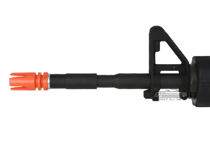 The fusion engine completely takes the place of the AEG's gearbox as a direct drop-in, which means that you no longer have to ever worry about stripped gears, broken pistons, or leaking cylinders. It is powered via a High Pressure Air (HPA) setup and only requires a small battery (7.4v-9.6v NiMH or Lipo recommended) to power the onboard computer, which is referred to as the Fire Control Unit (FCU), and is responsible for adjusting all of the features of the gun. Optional color-coded nozzles are available from PolarStar to be able to move the maximum FPS range either up or down. The PR-15 also uses a standard AEG-style hop-up and inner barrel design, which means it can still accept a large variety of standard AEG upgrade parts. Externally, this gun is extremely appealing. It features a full metal body, metal outer barrel, removable hand guard, realistic triangle front and removable carry-handle rear sights, and a six position LE-style stock.