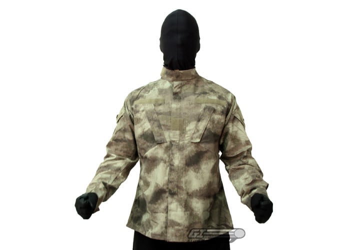 [H06D00][09150 / F545938379L1]A-TACS is the latest Camouflage to hit the market and has made a huge splash within the tactical community, having been developed by Digital Concealment Systems to answer the call for better and more effective camouflage system integration for personnel in any service branch from the military to law enforcement. A-TACS, much like other popular camouflage patterns was designed as a universal pattern for a wide range of operation environments. This coat is made from a polyester and cotton rip stop blend for higher durability, abrasion and bursting strength, and features two tilted chest pockets on the front of the coat as well as two shoulder pockets with Velcro for mounting patches. The left sleeve features a 3 slot pen/pencil pocket which is perfect for administrative duties on the field, and a mandarin collar allows the user to wear the coat with a full collar or low collar when it is necessary. This coat is sure to stand up to extremely intense environments all while keeping you hidden and providing a great amount of storage.