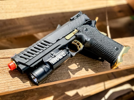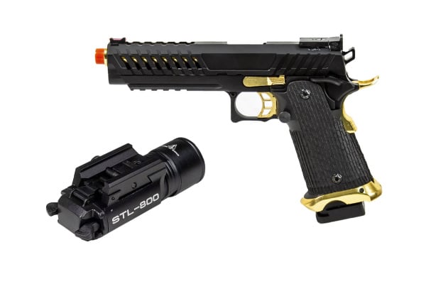 Quickdraw Package #1 ft. Lancer Tactical Knightshade 1911 Gas Blowback Airsoft Pistol (Black/Gold)
