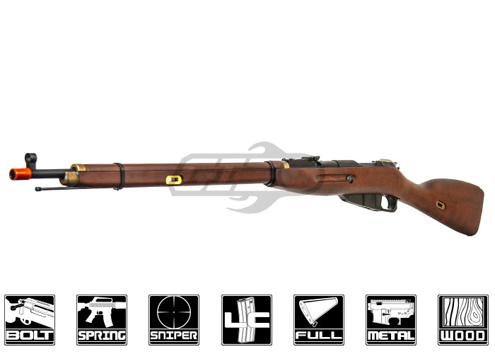 The Mosin-Nagant, developed by the Imperial Russian Army between 1882-1891, was most commonly used by the Armed Forces of the Russian Empire, Soviet Union, and other Nations. The Mosin-Nagant was a bolt action, internal magazine-fed military rifle. Designed similar to the real gun counterpart, the Red Fire Mosin-Nagant is an extraordinary replica for collectors and airsoft players alike. The externals of the gun feature a well finished wood stock, steel bolt, and unique serial number to replicate the real gun counterpart. The Mosin-Nagant features a unique internal magazine function. Lastly, there are two sling mounting points in the front and rear of the rifle as well as a plastic bayonet to finish off the gun's appearance. Overall, this airsoft gun is a very unique yet functional airsoft gun that is a must for collectors and airsoft players alike.