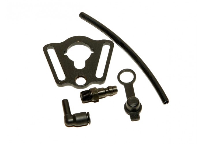 Package Includes: One (1) Ambidextrous Sling Plate, One (1) Custom Quick Connect Nipple, One (1) 90 Degree Air (milsim) Adapter