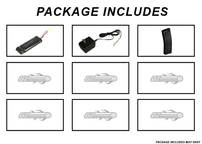 Package Includes: Gun, high-cap magazine, battery, charger.