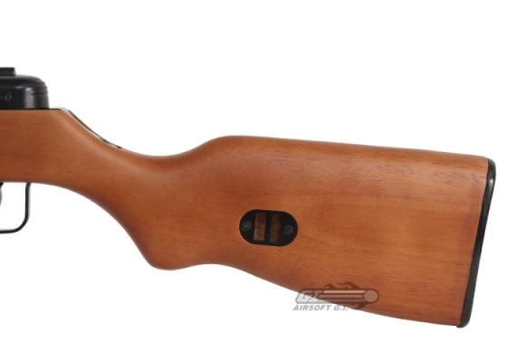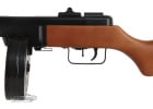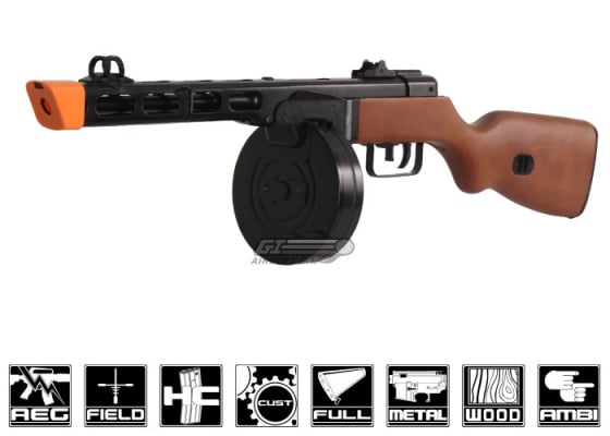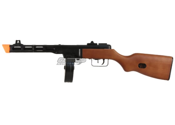 The S&T Full Metal / Real Wood PPSH Electric BlowBack Airsoft Gun is a great choice for the avid player or novelty collector. The build quality on this gun is amazing, it's made from steel and wood, just like the real one. The upper receiver splits away from the lower to allow access to the quick change spring system and hop up adjustment. Included with this amazing looking gun is a 2000 round high capacity drum magazine. To top everything off, the gun features exquisite externals and solid internals, real wood furniture, and a realistic blowback system that adds an extra element of realism to this already great airsoft gun.