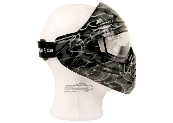 The Save Phace face mask is an ANSI Z87.1 rated face mask that is made of an extremely durable polymer. It has an extremely low profile so you are able to use your iron sights while still being able to protect your face, and is extremely rigid, having been designed to take some tough hits by anything from BB's to simunition rounds. The lenses are coated with military grade anti-fog, anti-scratch and UV coatings that give them a clear picture. Adding to the overall appearance of the mask, the graphics are very detailed and really differentiate Save Phace masks from other, more run-of -the-mill face protection.