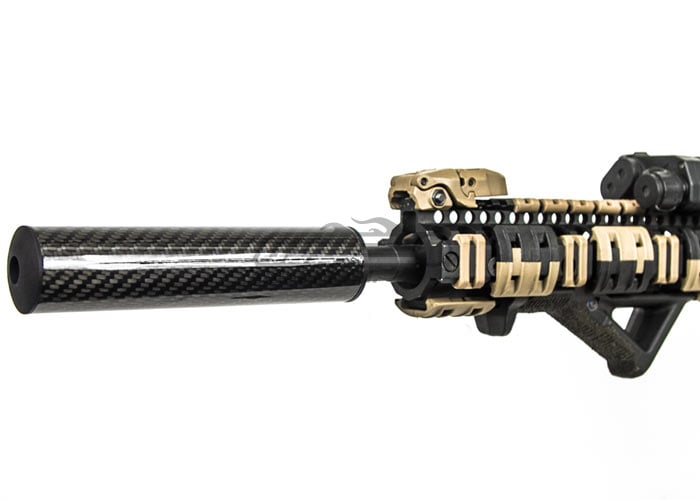 Scatterplot has been known for making sorbothane pads for airsoft guns. They have expanded their inventory with the Carbon Fiber Barrel Extension. The entire body is created out of 100% carbon fiber tubes. These tubes have been coated with a high gloss, 2-part urethane, oven-cured clearcoat. This coating is very hard and does not scratch easily. The endcaps are made from CNC machined 6061 aluminum that have been professionally anodized to a flat matte black color. The endcaps have been glued in with oven-cured aerospace grade epoxy and will NOT come out if you bang them around- they're on there good. The overall weight of the 160mm barrel extension clocks in at around 3.5 ounces. This is extremely lightweight compared to the standard aluminum barrel extensions. The carbon fiber look gives your airsoft gun a whole new look and can help cover up a longer inner barrel.
