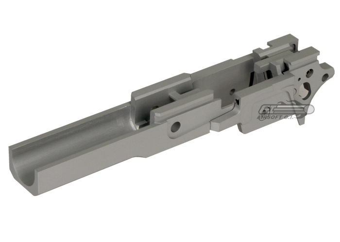 The Shooters Design CNC 2011 Chassis is made for the Hi Capa 5.1. Shooters Design is one of the most well known and highly regarded companies for pistol upgrade parts; they have CNC machined this fine chassis out of aluminum and blasted to give it a cool finish. This is a great upgrade for the airsoft connoisseur that expects nothing but the best from their equipment. The standard chassis on the Hi Capa is not made from quality metal and can break easily if dropped. However this aluminum chassis is much more robust and lighter, this piece will significantly reduce the overall weight of your pistol. Keeping weight down is very important for race shooting. Shooters Design has been making some of the highest quality upgrade parts for gas pistols almost since the beginning of airsoft, and their experience and craftsmanship is evident in this chassis.