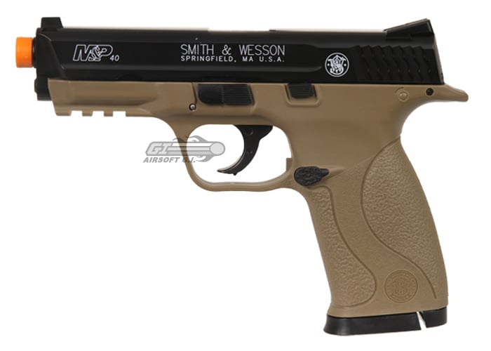 The Cybergun Smith & Wesson M&P40 Spring Pistol Airsoft Gun (Dark Earth) is the perfect airsoft gun for someone to get the taste of what airsoft is like. This pistol is lightweight and constructed of plastic. On the side of the slide are official trademarks. The slide, which needs to be cocked back before every shot, moves just like the real thing. Whether you just want to target practice with a cool looking gun or you want to start playing seriously on a budget, this Cybergun M&P40 is the fit for you! Also, this gun is perfect as an inexpensive and expendable movie prop, combine the right lighting with the real trademarks and you've got a perfect non firing prop gun.