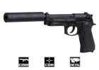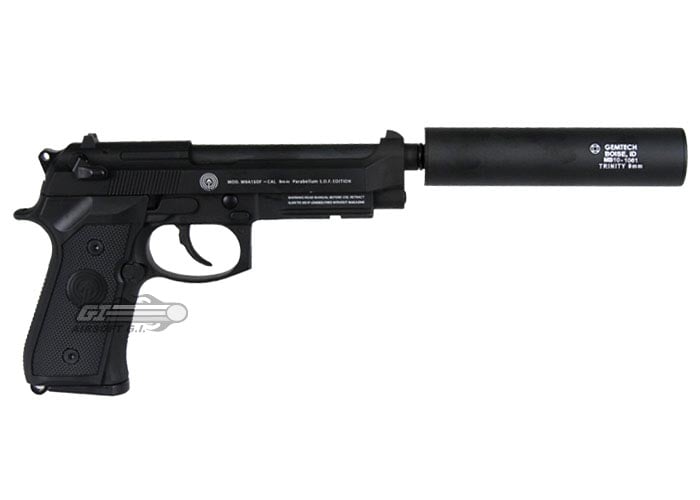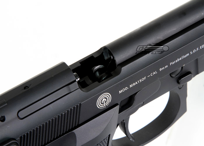 The SOCOM Gear Full Metal M9A1 SOF is an excellent new pistol that was just added to the SOCOM Gear line up. The slide is solidly constructed of metal with white etching on the side for a realistic action and look. The lower frame is also metal for a realistic feel and weight; and the frame features a weaver rail to mount lasers and flashlights. Included in the box is a 14mm CCW threaded adapter so you can attach the included barrel extension for an even more special operations look; the adapter can be removed in the event that you prefer a classic military look. The grips are textured panels for comfortable feel with or without gloves. SOCOM Gear guns are always quality built and competitively priced.