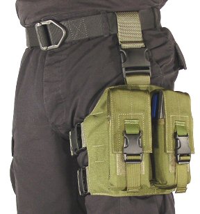 This rig carries 4 mil-spec M-16/AR-15 type 5.56mm 30 round magazines in two pouches attached to a leg shroud with a vertically adjustable hanger strap to suspend the pouches below the belt line with 2 adjustable 2" wide leg straps to secure the assembly to the upper thigh.