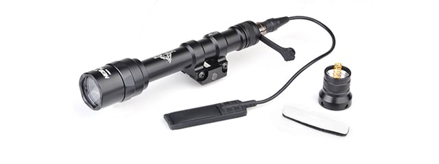 The Tac 9 Industries M600AA Mini Scout Light is a compact flashlight that attaches to the rail system on an airsoft gun, without sacrificing too much space and weight on the rail. The light uses a CREE Q5 LED with 200 lumens of output to allow the user to get a good spot light on their target. The light comes with an updated/Gen2 pressure switch included in the box to have a quick access switch attached to the rail or foregrip of a weapon. The TAC-9 M3600AA scoutlight is a lightweight option for a weapon light for any rifle.
