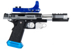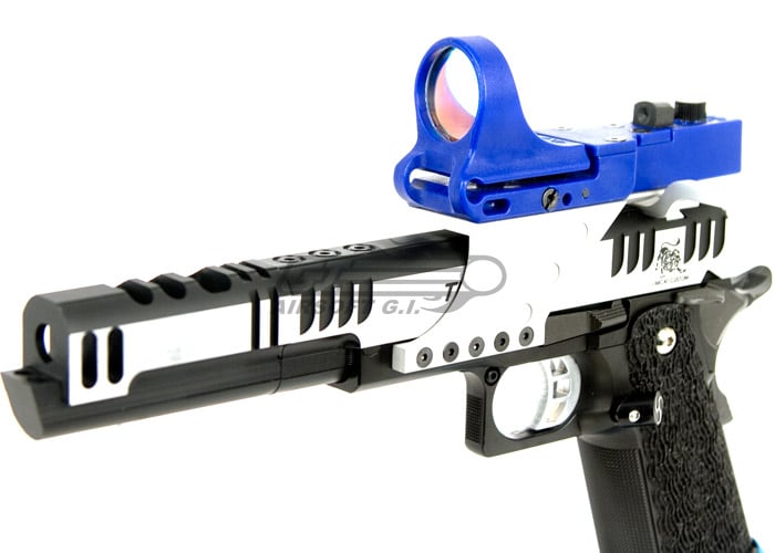 When creating the Tigercat Two Tone Open Class Pistol as well as other Competition Pistols, Targets On Sight uses the highest quality custom parts from factories overseas. Some custom parts are made to order and tailored to fit the individual gun. All their guns are properly maintained and cared for such as installation involving the matting of the slide, frame, and other parts. The slide and barrel are tightly fitted to ensure good accuracy. The blow- back unit was also tightly fitted to ensure gas efficiency. Lastly, the exterior of the gun is very well maintained and polished to ensure a smooth and desired finish. Target On Sights Competition Pistols were designed to overthrow your obstacle with speed and accuracy.