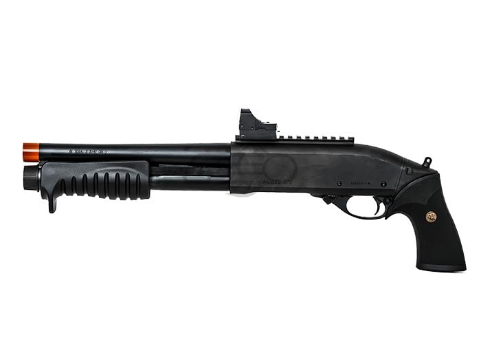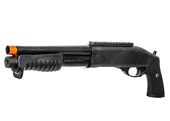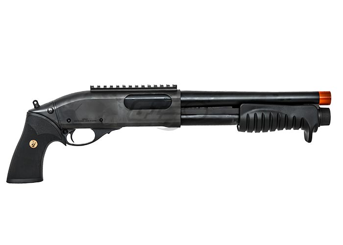 A major advantage that a gas powered airsoft shotgun has over a spring loaded airsoft shotgun is the ease in which it takes to cock the gun. Without a spring needing to be compressed, the handguard moves almost effortlessly for speedy followup shots. In addition, the realism in both operation and sound is unparalleled in gas airsoft shotguns.