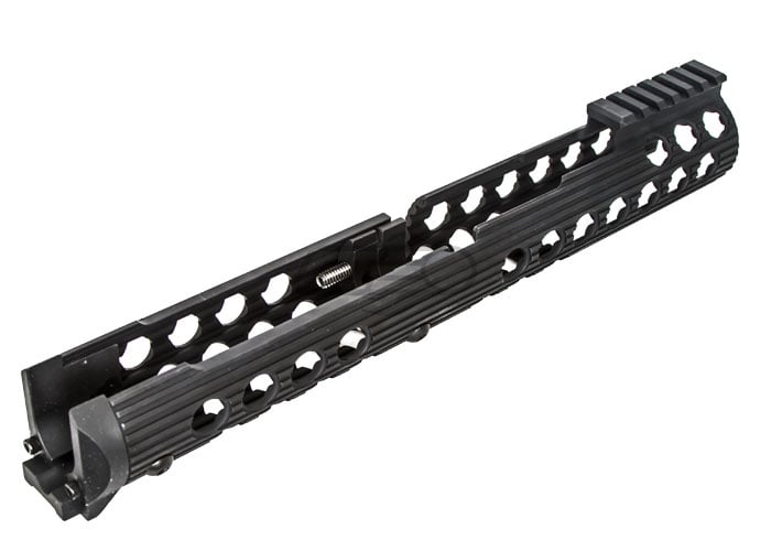Comfortable and sleek replacement of the standard wood or plastic hand guards for the AK-type rifles. The hand guard extends by 7 inches past the standard AK hand guards allowing for more shooting stance options. The 3 inches of Picatinny rail provides space to put optics and accessories. The low profile of the rail will allow co-witness with various optics. The cooling holes allow the rail to run cool, even after extended firing and will not be effected by heat the way wood or plastic hand guards are. The cooling holes also allow the use of Troy Rail Sections for additional versatility. Machined from hardened aircraft aluminum with stainless steel components and finished in MIL-SPEC hardcoat anodizing. The hand guard is designed to be used with both stamped and milled receiver AKs which use a standard length hand guard and the sling mount on the hand guard retaining band. May not fit all AK variants, please contact if unsure of fit. Any modification to product will void all warranty. The Bottom Rail will work with factory gas tube/top hand guard, independent of the Troy Railed Gas Tube. Replaces factory hand guards easily; no gunsmithing required.