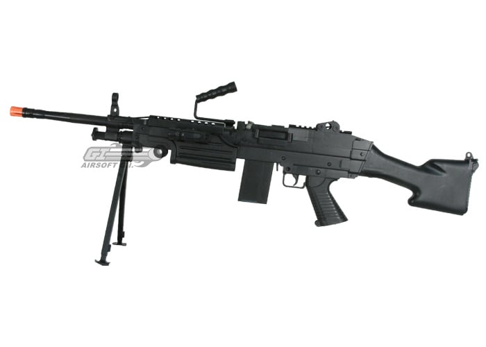 This gun is a low powered spring airsoft gun that is extremely affordable and non-upgradeable. Please keep in mind, this gun is not skirmish ready and will be easily out performed by most quality airsoft guns. This gun is non serviceable and does not come with a warranty of any kind. More then likely if you attempt to use a gun on a sanctioned field you will get decimated. This gun makes a great display piece but do not belong on the field. If you are interested in a high quality, skirmishable AEG then the A&K Full Metal M249 MKII Airsoft Gun will definitely fit the bill. You can check it out here, A&K Full Metal M249 MKII Airsoft Gun with Box Magazine The Echo 1 LMG is also a great choice if you are looking for a unique SAW type AEG, you can see it here, ECHO 1 Full Metal / Real Wood RED STAR LMG Airsoft Gun