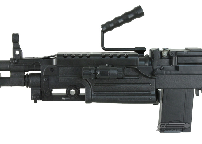 The UK Arms M249 spring airsoft gun package includes a full plastic m249 paired with a plastic 1911 style handgun. The UK Arms M249 features realistic style features that you can find on a high quality M249 such as a folding bipod, carry handle, and full stock. Despite these realistic features, the UK Arms M249 leaves much to be desired in performance, reliability, aesthetics, and durability. The UK Arms M249 operates by pulling the charging handle for each shot which is not preferable for a SAW style weapon. A M249 is typically used for enemy suppression due to its high rate of fire and large magazine capacity; however, the UK Arms due to its operation can not be fired quickly and therefore cannot be used to suppress an enemy advance.